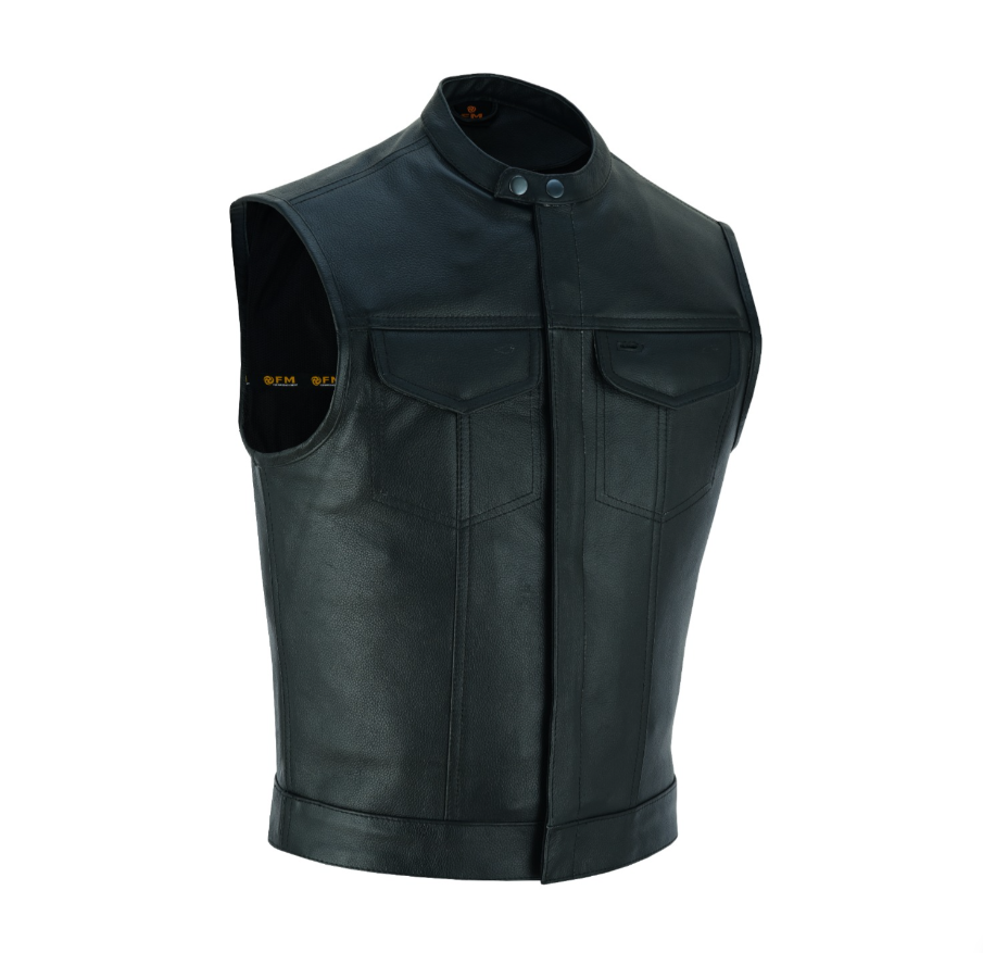 FM черный мотоциклетный кожаный жилет с пуговицами и карманами - 100% натуральная, легкая, премиальная, байкерская, клубная жилетка из воловьей кожи с 5 застежками на кнопках.1) цвет: черный2) натуральная кожа толщиной 1,1-1,2мм3) узкие проймы4)Скрытая/скрытая застежка на пять передних кнопок5)Большая доступная задняя панель для крепления клубных нашивок или вышивки6) два наружных три внутренних кармана7)Воротник-стойка8) размерный ряд XS-7XL